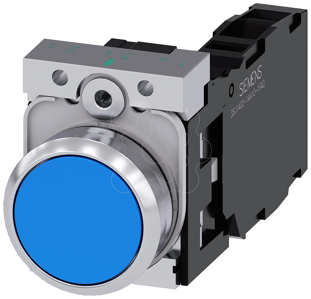 botão, 22 mm, redondo, metal, de alto brilho, azul, botão de pressão, plano, tecla com retorno, 1NA+1NF, conexão parafusada Botão de pressão SIRIUS ACT para a comutação e o comando de consumidores elétricos.Sob o nome de marca SIRIUS ACT, a Siemens disponibiliza um portfólio ímpar de aparelhos de comando e unidades de sinalização com aprovações de produto mundiais em três séries de design modernas em metal autêntico e robusto e plástico de alta qualidade.O inovador conceito de encaixe simplifica a montagem ao ponto de ser necessária apenas uma mão e nenhuma ferramenta especial. Como orifícios de montagem basta usar furos sem ranhura, pois já se encontra integrada uma proteção total contra torção.Graças ao tipo de proteção continuamente elevado, os aparelhos robustos são adequados para a indústria e a utilização no exterior. É mesmo possível a limpeza com jato de alta pressão. Nem pó, nem óleos ou lixívias agressivas podem perturbar a operação fiável.Além da fiação padrão, os aparelhos também podem ser ligados ao comando via PROFINET, AS-Interface ou IO-Link. Isso permite reduzir o trabalho de cablagem, minimizar as fontesde perigo e ganhar maior flexibilidade.O configurador online gráfico ajuda confortavelmente na seleção e no pedido de aparelhagens individuais, caixas e inscrições. Está disponível uma documentação abrangente (p. ex. manual, dados 3D, diagrama de conexão).Versões disponíveis: várias cores, com/sem iluminação, com/sem inscrição, acionamento por encaixe/contacto, diferentes alturas de botão de pressão e aro frontal.Nota: Aparelho completo, entrega inclui suporte e módulos.SIRIUS ACT - Performance in Action ao efetuar um comando e notificar. Simples de montar, simplesmente resistente, simplesmente perfeito.