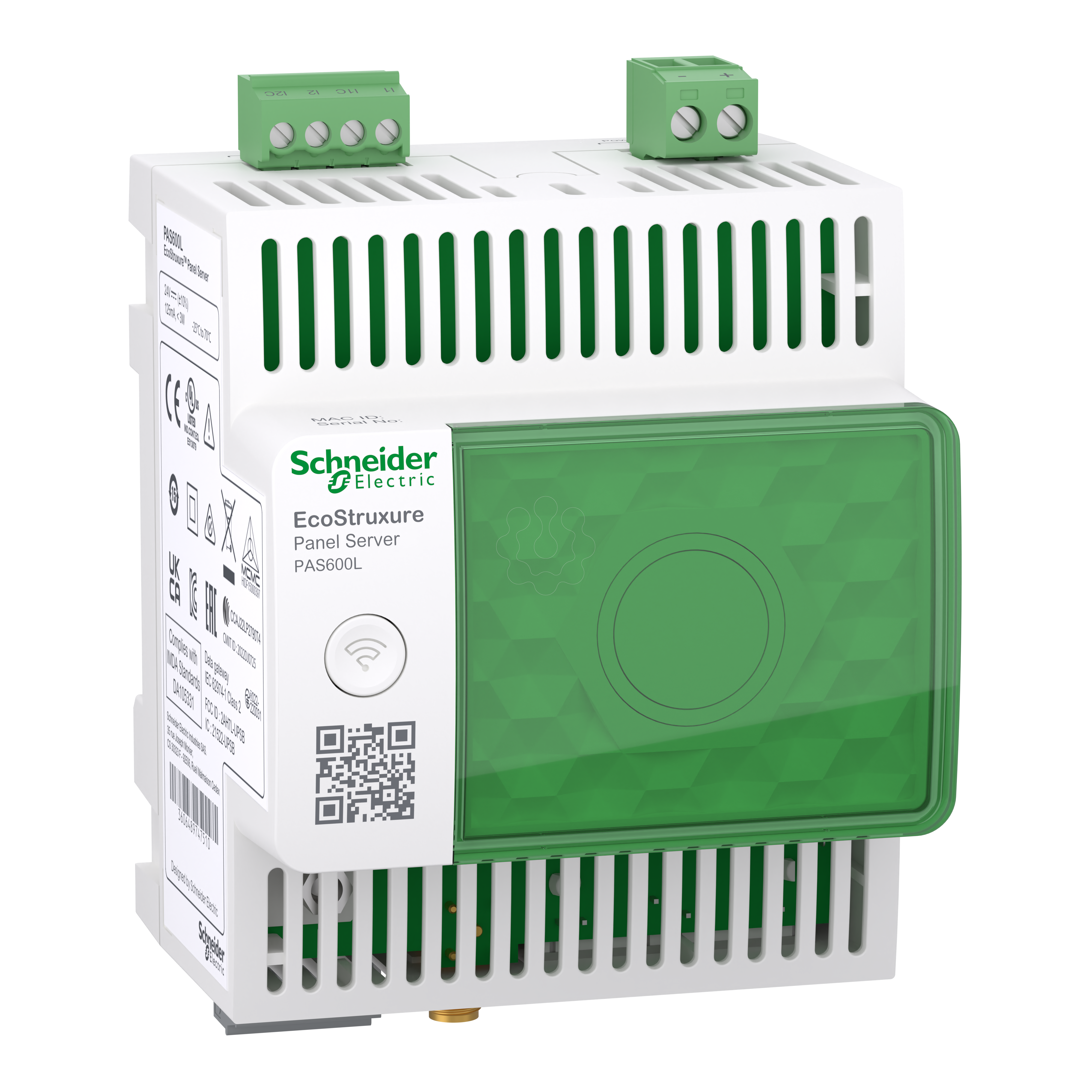 O EcoStruxure Panel Server é um gateway que fornece conexão de dispositivos IoT inteligentes com ou sem fio a software de controle de borda ou aplicativo em nuvem. Conecte dispositivos sem fio da Schneider Electric, como PowerTag Energy, PowerLogic HeatTag, Power Tag Ambiant, Power Tag control e outros. Conecte a maioria dos dispositivos Modbus/RS485 e Modbus/TCP do mercado, incluindo medidores de energia e dispositivos de proteção da Schneider Electric. As páginas web amigáveis oferecem monitoramento de primeiro nível de medições de todos os dispositivos conectados, incluindo registro de todos os alarmes. Solução de problemas simples ou o sistema através de páginas da Web incorporadas com informações e logs de diagnóstico avançados. Comissionamento fácil por meio de páginas da Web incorporadas ou com o EcoStruxure Power Commissionig, que oferecerá relatórios de comissionamento e recursos avançados. As dimensões do produto são as seguintes: largura 71,8 milímetros, profundidade 70,2 milímetros e altura 85 milímetros. Fonte de alimentação 24VDC 3W máx. -25°C a +70°C Temperatura de funcionamento. 5-95% de umidade relativa. Principais certificações, incluindo CE, UL/CSA, IEC61010, UL61010, IEC61974-1, certificação marítima, IEC61443-4-2, RCM, EAC e UKCA. "O gateway pode ser montado em trilho DIN em um gabinete modular. Possui conectores IP20, bico frontal IM40 e IP30 nas demais faces." Dois conectores RJ45 ethernet 10/100 Base-T. Conector de estilo aberto Modbus RS485. One connector for external Wi-Fi/wireless network antenna. Connector for two Digital Inputs for dry contact or WAGES. Conexão celular direta por meio de roteador LTE externo conectado por Ethernet ou Wi-Fi. Ajuste perfeito para o software EcoStruxure Edge, como Power Monitoring Expert, Power Operations e EcoStruxure Building Operations. Projetado para aplicativos de nuvem EcoStruxure, como Facility Expert, Asset Advisor e Resource Advisor.