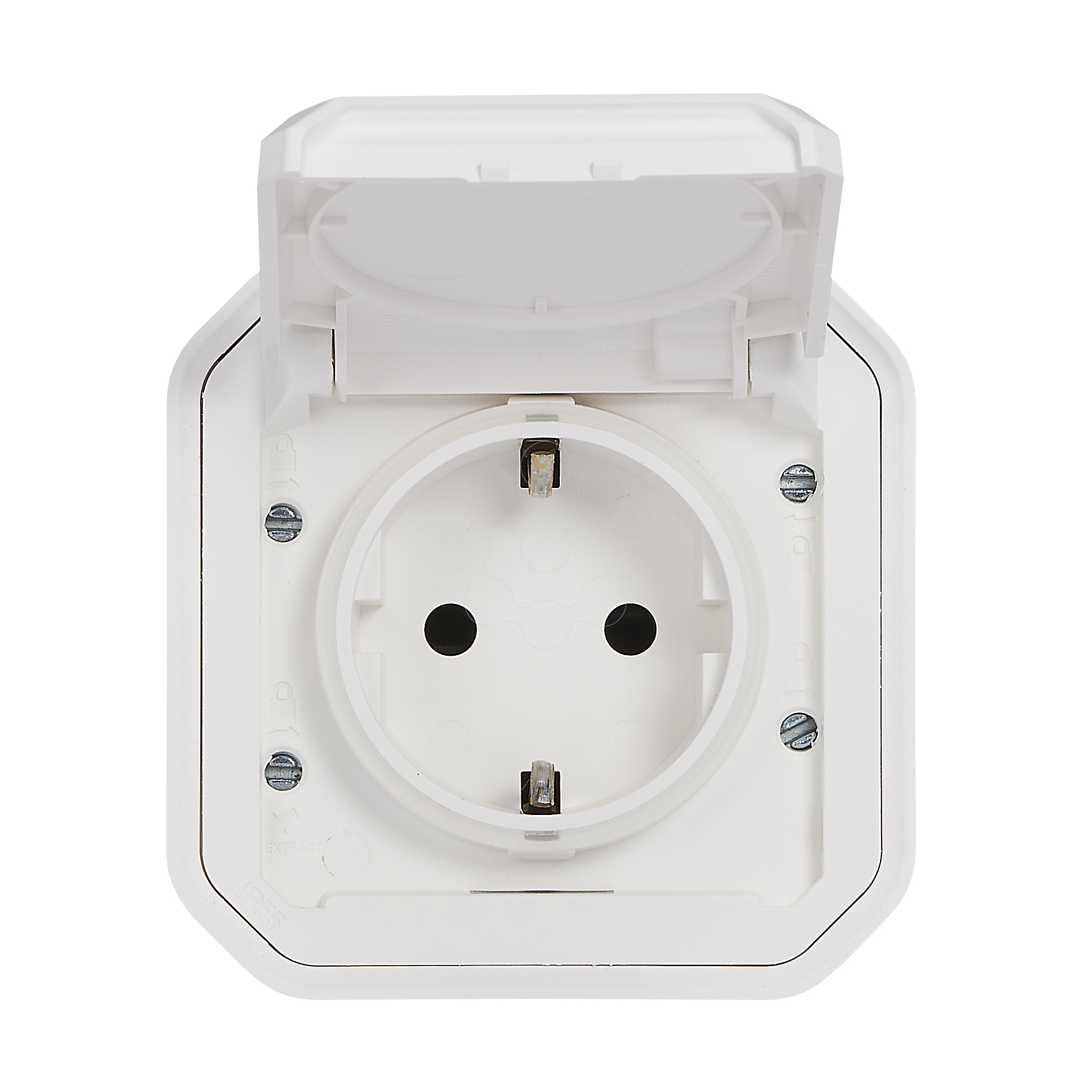 Plexo IP 55 monobloco saliente - Tomada 2P+T Schuko, lig. automáticos, Branco